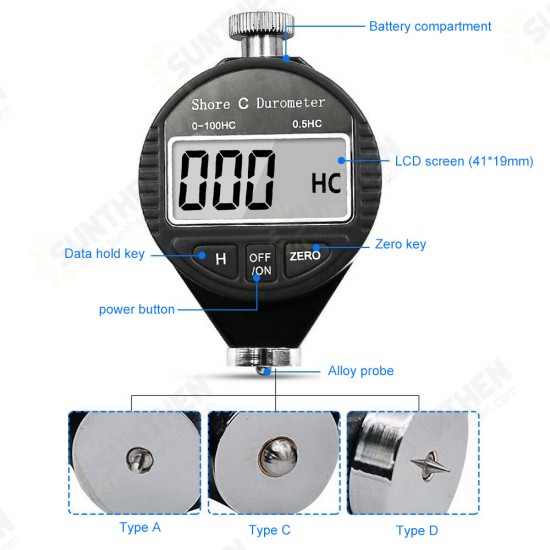 Type A and Type D are respectively suitable for testing low and medium hardness and high hardness materials. Type C is suitable for testing the hardness of microporous materials for shoes made with a combination of rubber and plastic when the compression is 50% and the stress is above 0.049MPa. The plastic contains foaming agent.