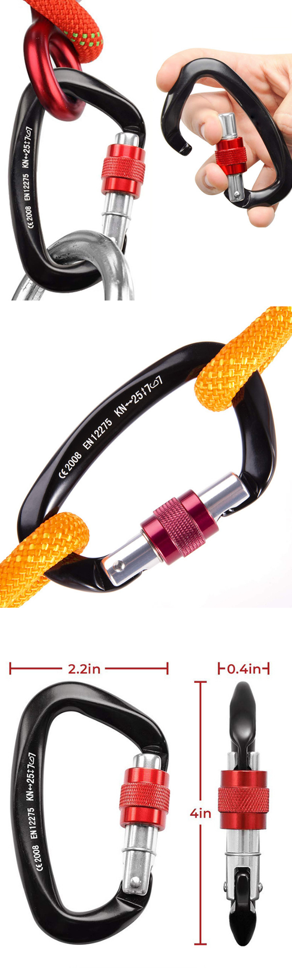 Twist Lock: 25KN twist lock carabiner, instantly lock and one hand to open, 2 Way locking, a simple twist the barrel and push against the spring load will open. Automatic re-locking when release the pressure.