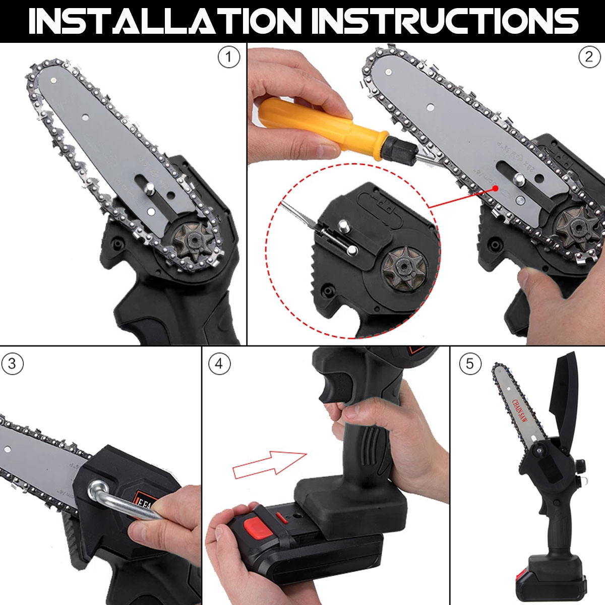 ● Sharp & Strong Chain:High quality alloy chain, wear-resistant and durable, fast and smooth sawing without jamming. ● Wide Application:This electric chainsaw has a wide range of uses, can be used for Forest cutting, cutting wood, pruning branches and so on. ● Brushless copper motor:Strong power, more output stable than the chain saw modified by the angle grinder. High load so that can not easy to burn. ● Portable Design:Soft rubber handle, anti-skid and sweat-absorbing; Widen baffle design, to prevent wood chips from splashing during cutting; Heat dissipation hole design, efficient ventilation and heat dissipation. | |
