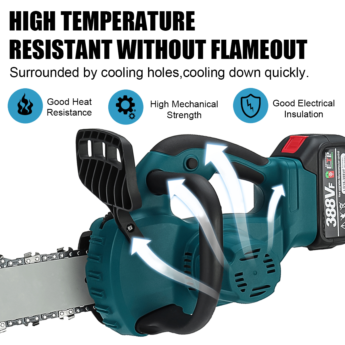 Soft rubber handle, anti-skid and sweat-absorbing; Widen baffle design, to prevent wood chips from splashing during cutting;Heat dissipation hole design, efficient ventilation and heat dissipation.