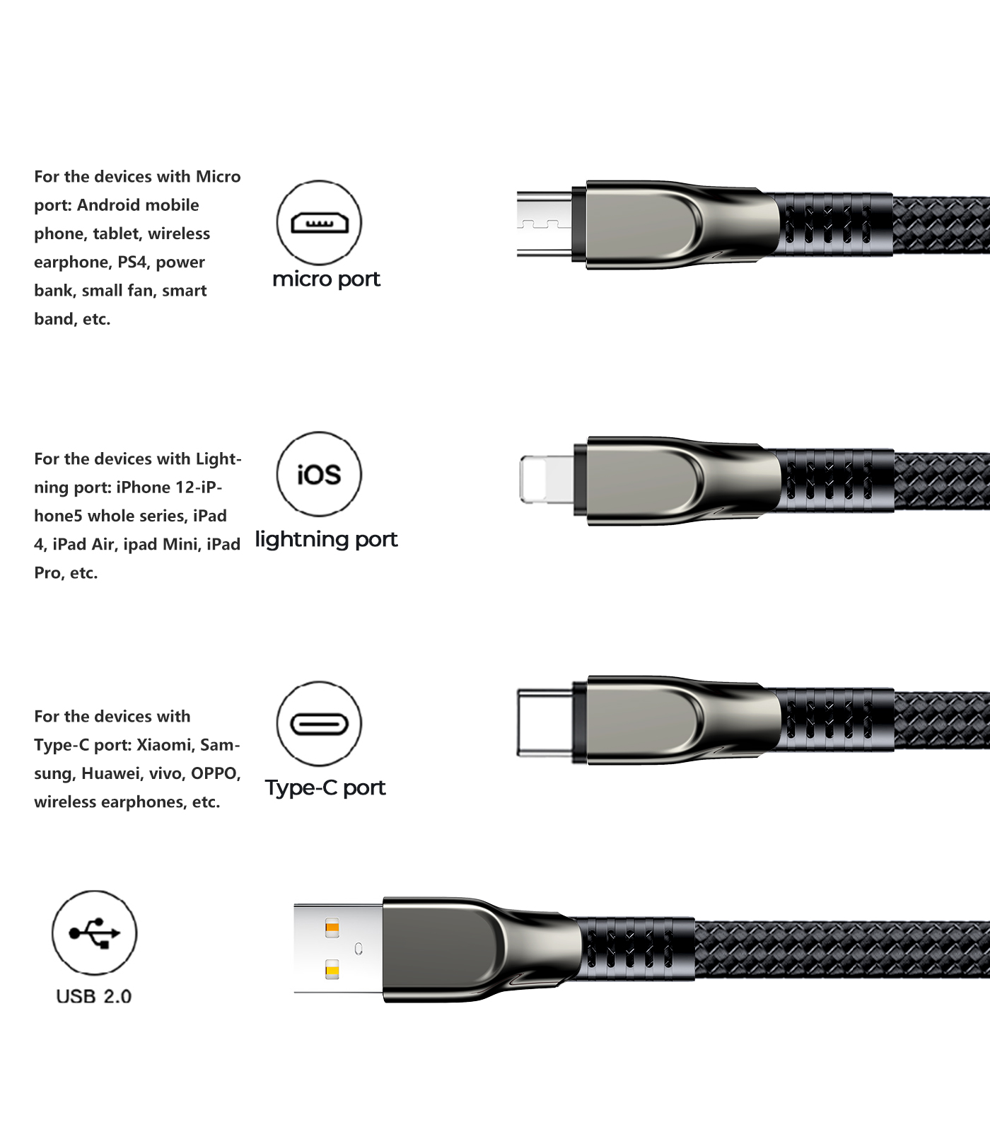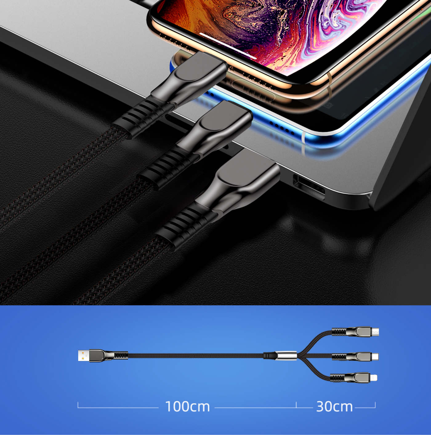 3In1 USB To USB-C/Micro USB/Apple Port Cable Fast Charging Data Transmission Cable 1.3m Samsung Galaxy Note S21 5G For iPhone 13 Pro Max Xiaomi 12