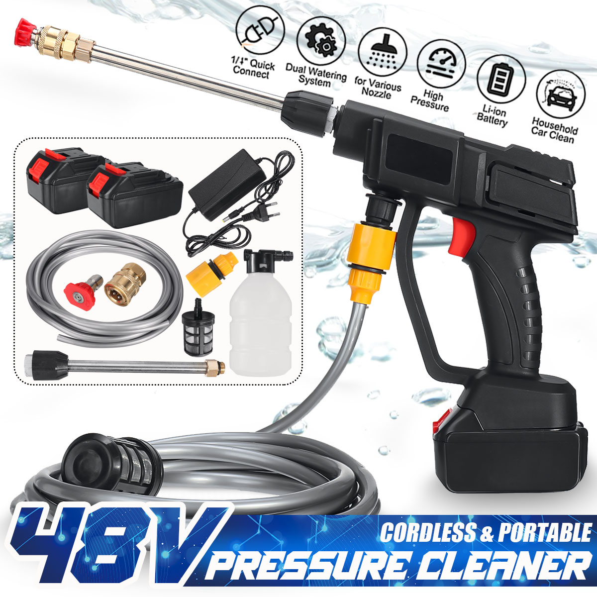 1 x Portable Pressure Cleaner 1 x 5M Filter Water Hose 1 x Copper Joint 1 x Quick Coupling 1 x Filter 1 x 15cm Extension Rod 1 x Foam Kettle 1 x Nozzle 1 x User Manual W/ 1/2pcs battery type 1 x Portable Pressure Cleaner 1 or 2 x 48V Battery (optional) 1 x Charger 1 x 5M Filter Water Hose 1 x Copper Joint 1 x Quick Coupling 1 x Filter 1 x 15cm Extension Rod 1 x Foam Kettle 1 x Nozzle 1 x User Manual |