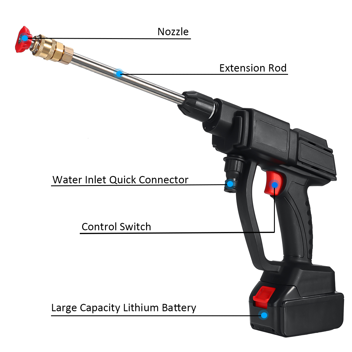 Material: Engineering Plastic Power: 600W Charger Voltage: AC 100-240V 50/60Hz Pressure:30 Bar~60Bar Battery Capacity: 25000 mAh Flow Load: 4 L/Min~8L/min Outlet Pipe Length: 5M Self-priming Height: 3 Meters Optional Pattern: Without Battery SET/1 Battery SET/2 Battery SET |