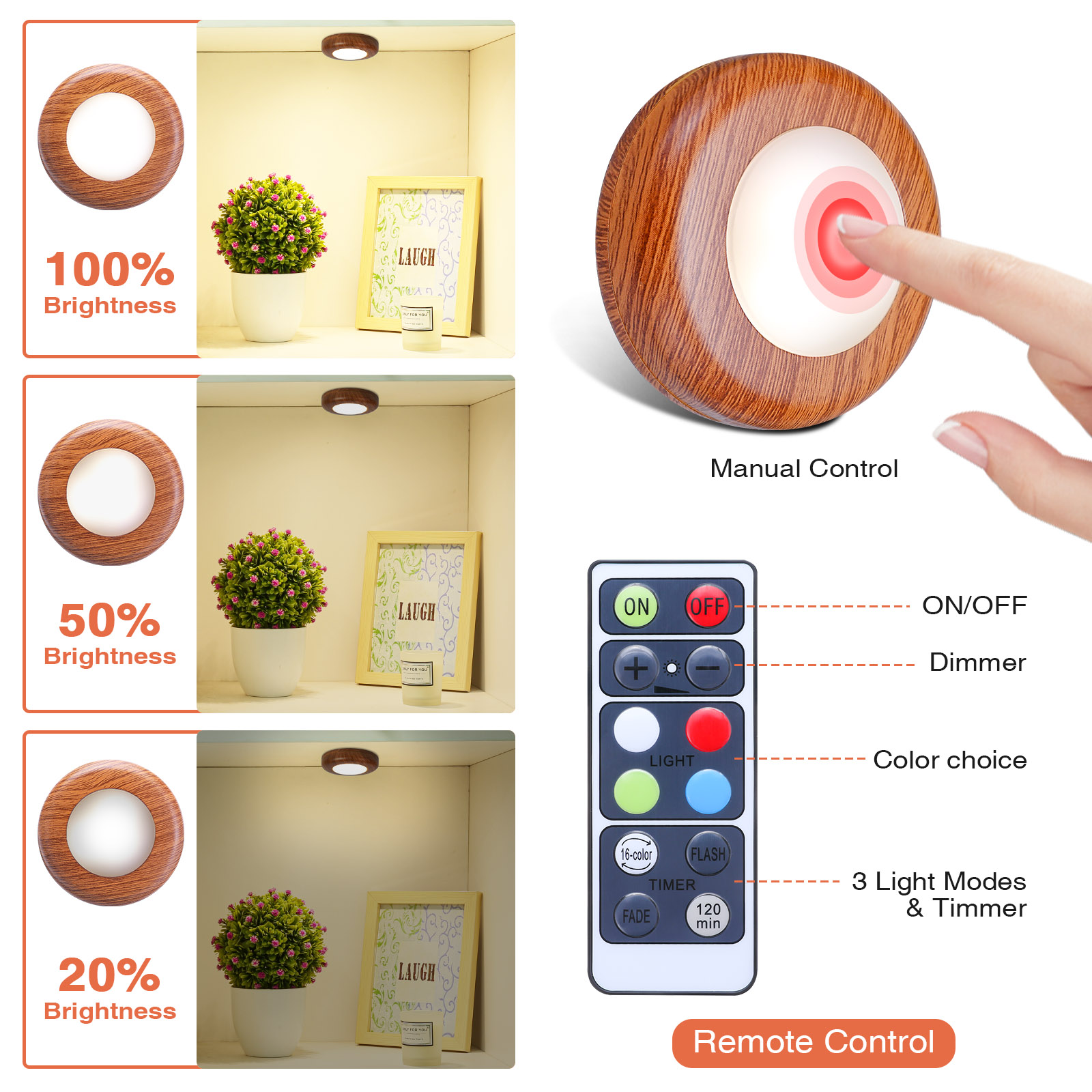 【Adjustable Brightness】 Each closet lamp is equipped with 3 super bright, energy efficient and eco-friendly LEDs, meeting the daily lighting needs. Use the remote control to adjust the brightness level, 10%, 40%, 60%, 80%, 100%.