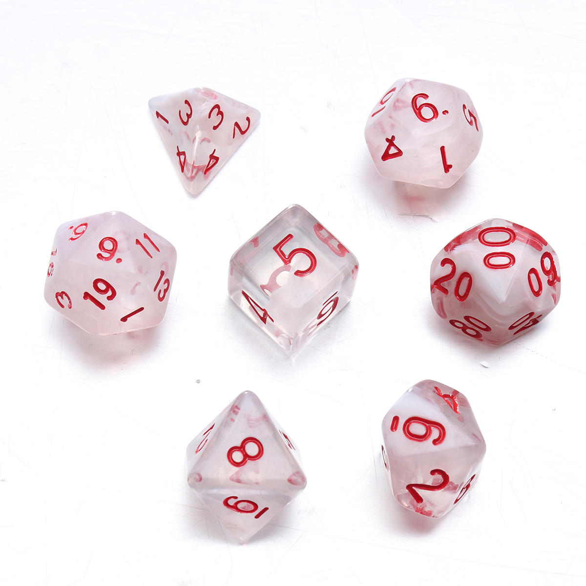 Dice specifications: floating white dots of pink oil, floating white dots of red oil, floating white dots of gold oil, transparent green purple, transparent purple blue, translucent red and yellow, floating black dots of gold oil