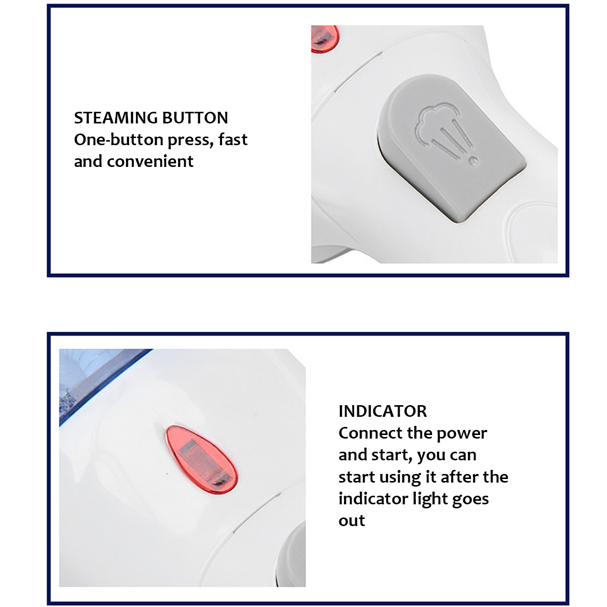 Connect the power supply, the red power indicator light is on, the heating element begins to heat up, and the red indicator light goes out before use. During use, the steam button is pressed and released rhythmically, and the front nozzle generates a large amount of continuous high-temperature and high-pressure steam.