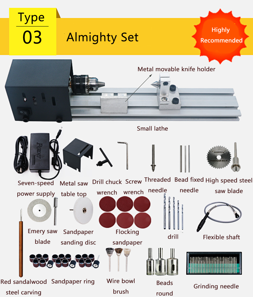Metal movable knife holder*1 Small lathe*1 Seven-speed power supply*1 Metal saw table top*1 Drill chuck wrench*1 Screw wrench*1 Threaded needle*1 Beads fixed needle*3 (1.5/2.0/2.5mm) Red sandalwood steel carving knife*1 High speed steel saw blade 50mm connecting rod*1 Emery saw blade 50mm connecting rod*1 Sandpaper sanding disc*1 Flocking sandpaper*6(80 240 600) |