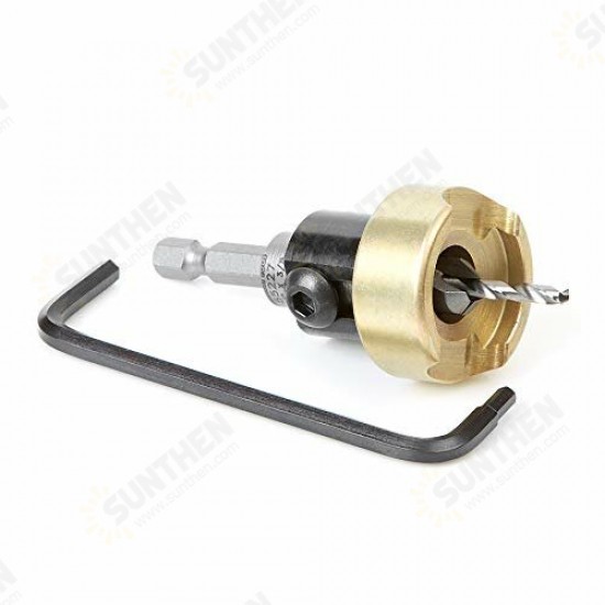 ▲ The adjustable depth-stop and independent stop collar prevent marking of the workpiece and perfect Countersink depth control, (A°) angle 49°, (B) Cutting height 3/64-3/8, (D) diameter 3/8, (D) shank 1/4, overall length (L) 2-5/8, wood screw size 4, D1 3/32. Carbide tipped 82 degree countersink with adjustable depth stop and no-thrust ball bearing 3/8 dia x 3/32 drill DIA x 1/4 inch quick release hex shank.