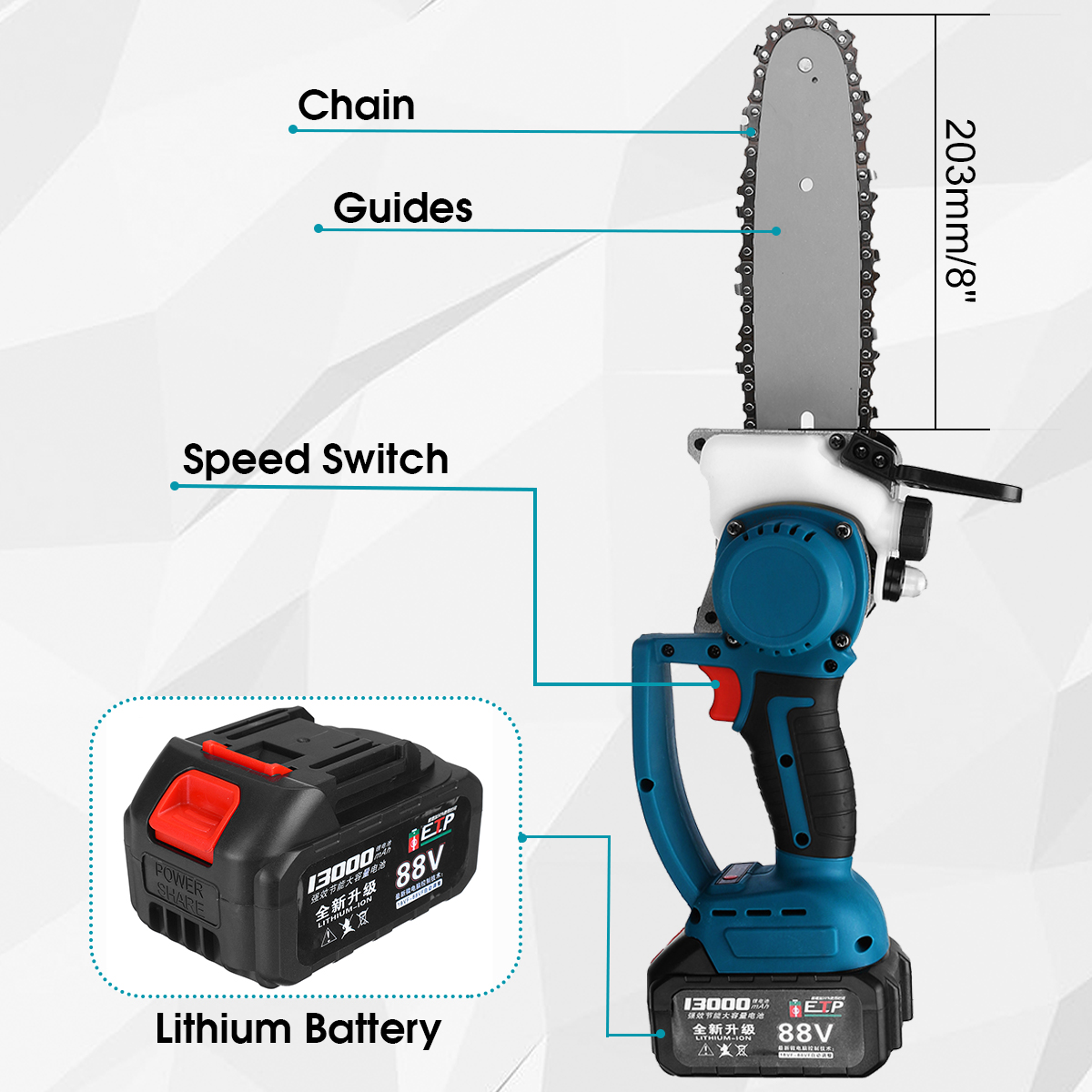 8. Brushless copper motor: Strong power, more output stable than the chain saw modified by the angle grinder. High load so that can not easy to burn.