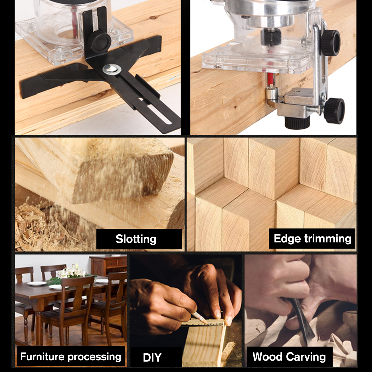 ● Can clearly observe the processing conditions. ● Transparent cover to control the flying sawdust. ● Standard 1/4 inch collet accepts most router bits. ● The motor reaches a high speeds to cut wood with precision and power. ● Widely used in wood processing, furniture manufacturing and other industries. ● Trimmer applicable under normal ambient conditions, equipped with the right rotary. ● Apply to wood, plastic sheeting, wood veneer and other similar materials chamfering, grooving, surface finishing, curve cutting, planing wood edge, pattern processing operations activities. | |
