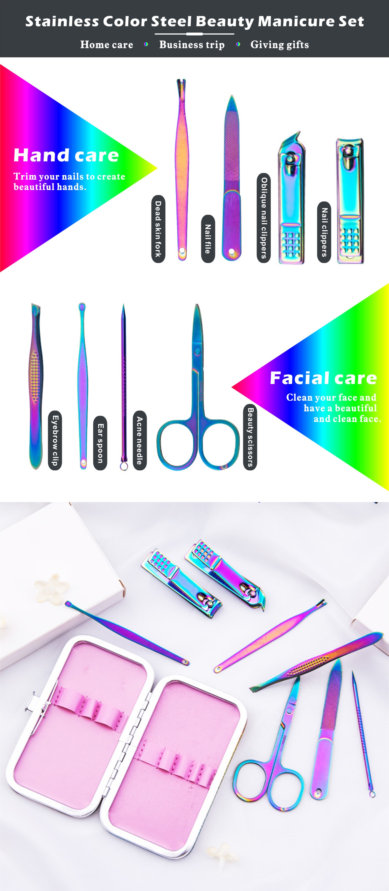- 8pcs manicure set: Facial care tools(eyebrow Scissors, Peeling Knife, Yebrow Tweezer, Blackhead & Acne Needle); Manicure Kit(Nail File, dead skin fork, cuticle knife, slanted edge Nail clipper).