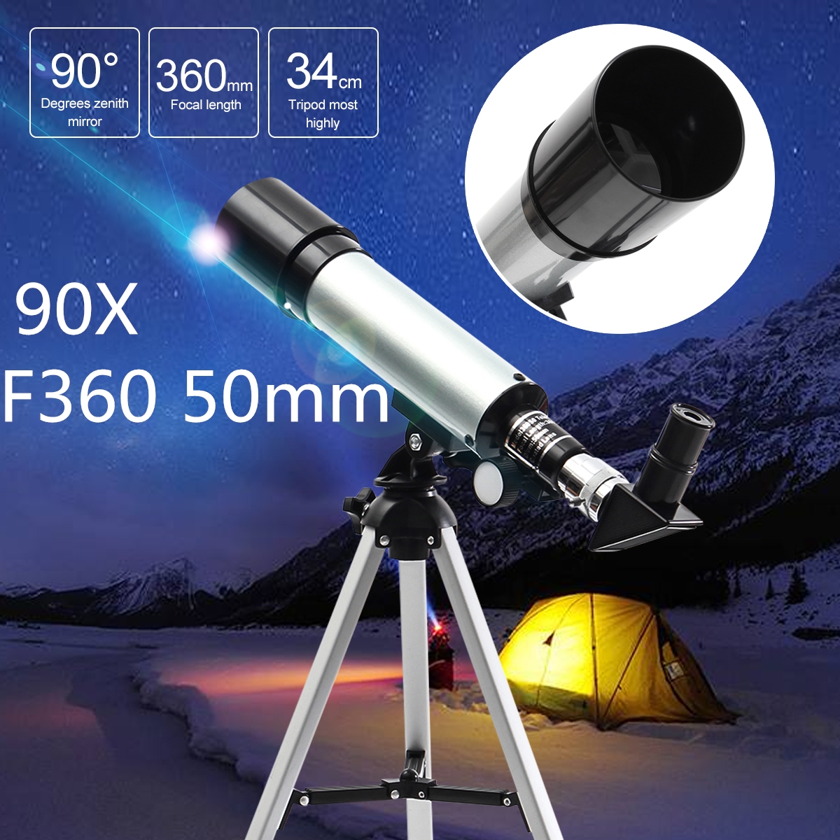 90X F36050M 50mm Monocular Telescope Astronomical Refractor Telescope Refractive Eyepieces Tripod Beginners 2.800 Arc Seconds