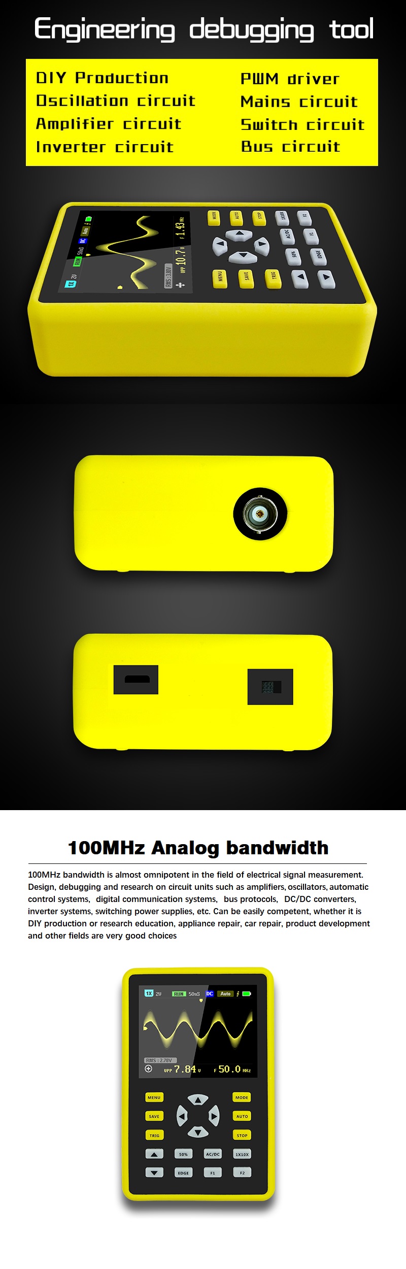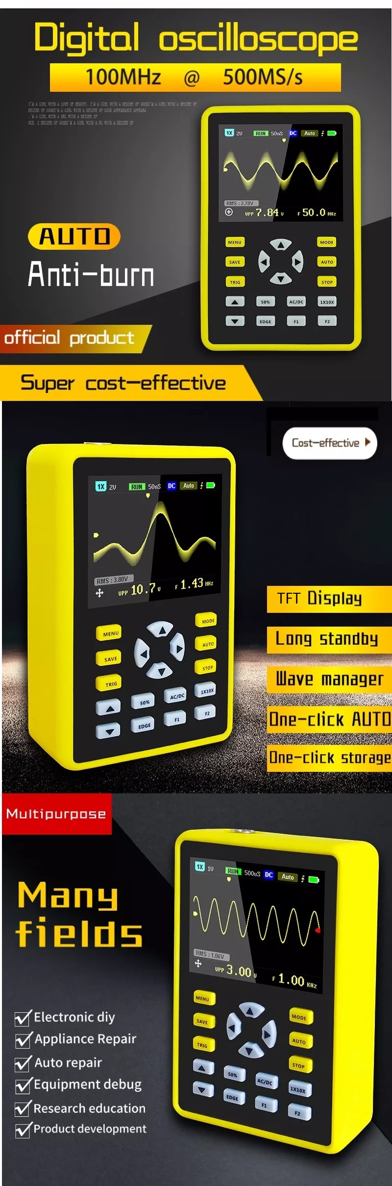 The ADS5012H is a versatile, highly practical, cost-effective handheld oscilloscope for the maintenance industry and the R&D industry with DANIU's real-time sampling rate of up to 500MS/s and 100MHz analog bandwidth.With full trigger function (single, normal, automatic), it can be used freely for both periodic analog signals and non-periodic digital signals. The built-in high voltage protection module can withstand up to 400V continuous voltage and 600V peak voltage. There is no need to worry about the oscilloscope burnout caused by the high voltage not being probed to the 10X position.Large time base scan mode that monitors slow level changes. Equipped with high-efficiency one-button AUTO, the measured waveform can be displayed without complicated adjustment. Display high-definition LCD screen with 2.4-inch 320*240 resolution TFT full-vision technology, the visual effect is very good. Extremely convenient and fast waveform storage function, built-in 64M storage space, can store up to 2000 waveform pictures, the storage process is simple and fast, save the current waveform anytime and anywhere, just one touch, no cumbersome tips and choices. Powerful waveform file manager, support for thumbnail browsing, viewing, detail viewing, page turning, deletion and more. Built-in 3000mah high-quality lithium battery, can be used continuously for 8 hours when fully charged.The body is equipped with high-quality silicone protective cover, non-toxic and lead-free environmental protection, anti-skid, anti-shock and shockproof, comprehensive protection of the fuselage, soft texture, feel very comfortable.