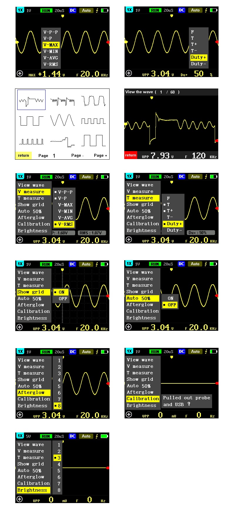 9: Up to 12 parameters measurement: VPP, VP, Vmax, Vmin, Vavg, Vrms, Frequent, Duty+, Duty-, Time+, Time-, Time