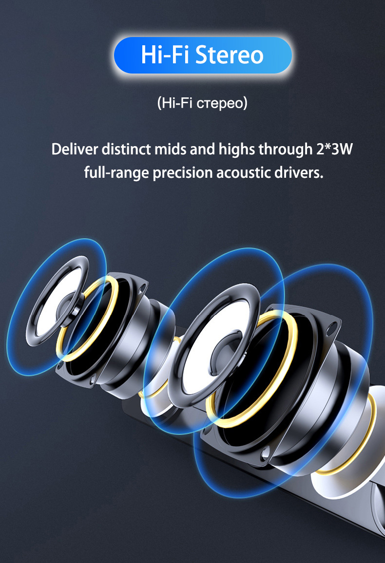 The computer speaker owns a delicate sleek design style with a concise line, bring you the most comfortable for the visual experience. Compact size is very suitable for the computer screen, save desktop space.