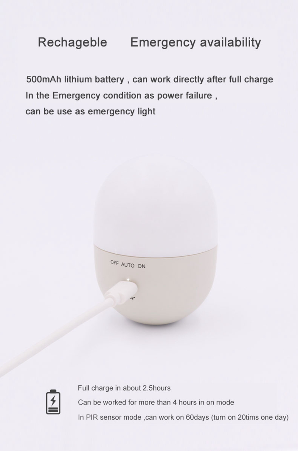 - Built-in 500mAh battery, you can use a sensor light or emergency light.