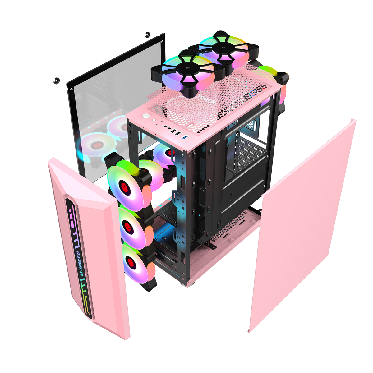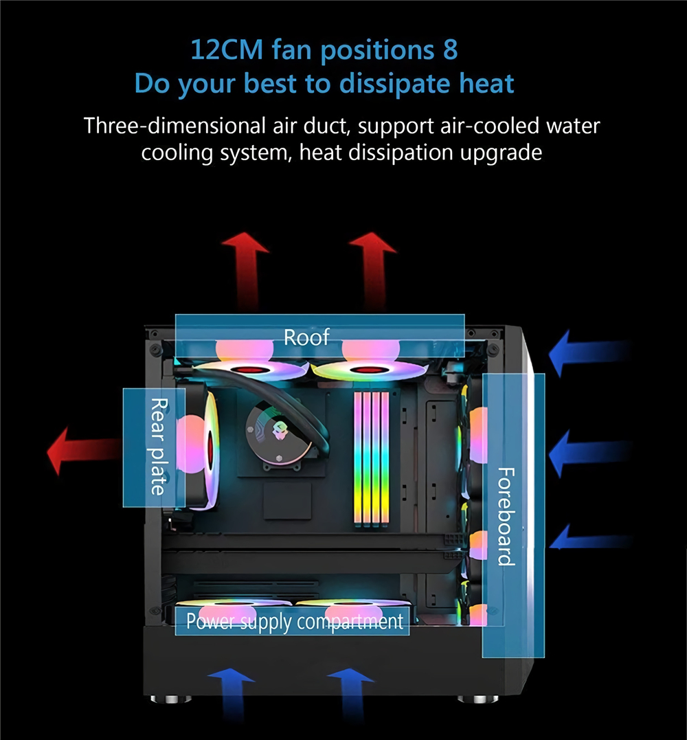 ● The PC supports up to 8 120MM chassis cooling fans(The chassis does not contain a fan) , can be freely DIY, support water cooling installation