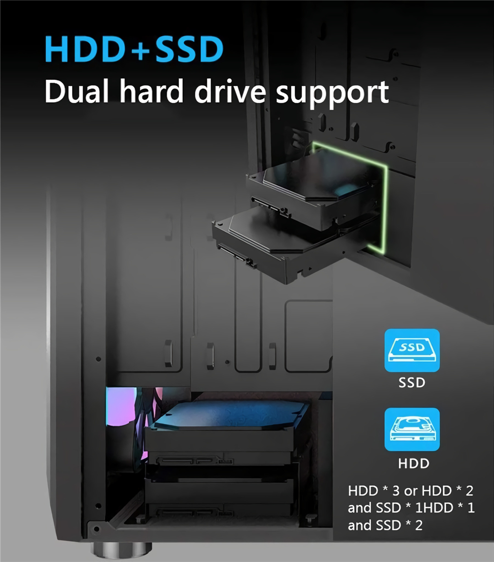 ● CPU cooler height supports up to 165MM, and supports graphics card length up to 315MM, hard drive slot, SSD supports 2.5 inch SSD * 1, HDD supports 3.5 inch HDD * 1