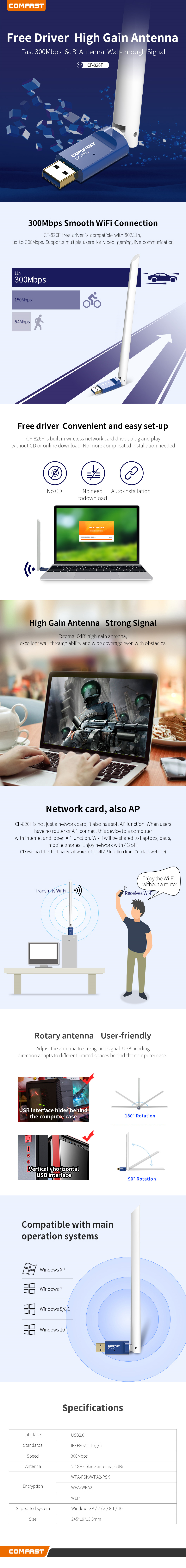 CF-826F USB 2.0 Wireless Network Card 300Mbps Portable Drive-free WIFI Receiver Transmitter for Desktop Computer Laptop PC