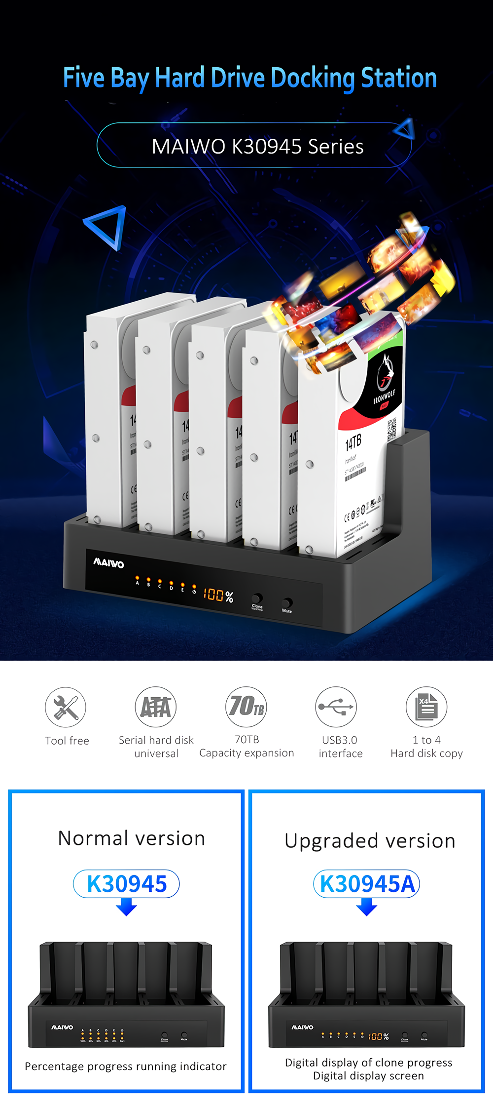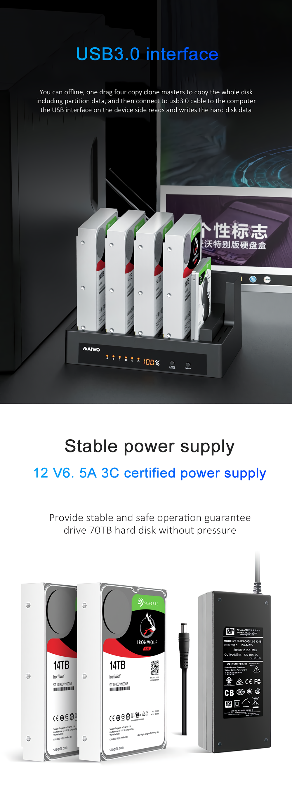 The cloning mode of the product is one drive four clone hard disk, which can copy hard disk partition, hard disk with system and audio-visual office files.