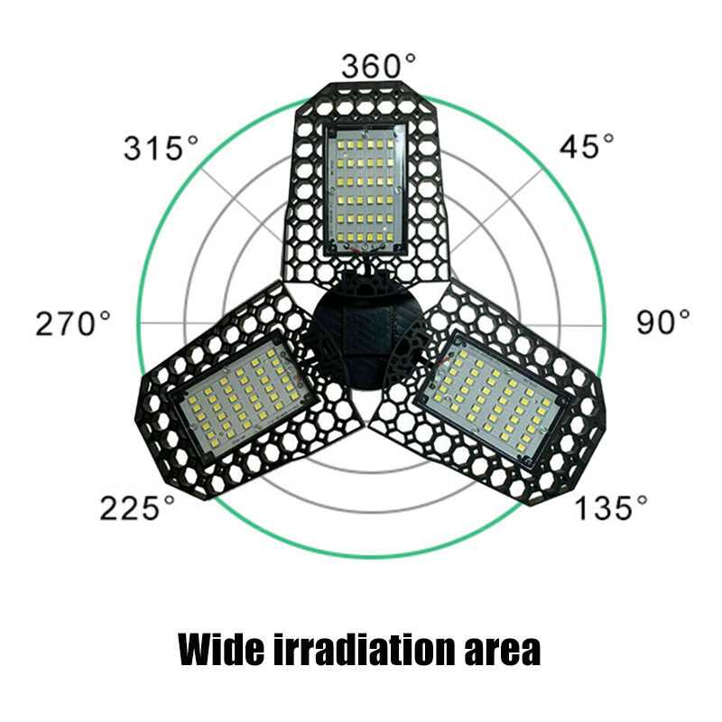 LED garage lighting with a unique adjustable wide-angle design, each wing 90 degree adjustable, which can have a perfect garage lighting distribution curve according to your application, this will make the light cover 360 ° area. Just Perfect for garage, workshop, warehouse, basement, auto shops, carports office, shopping mail, workshop, anywhere need bright light.