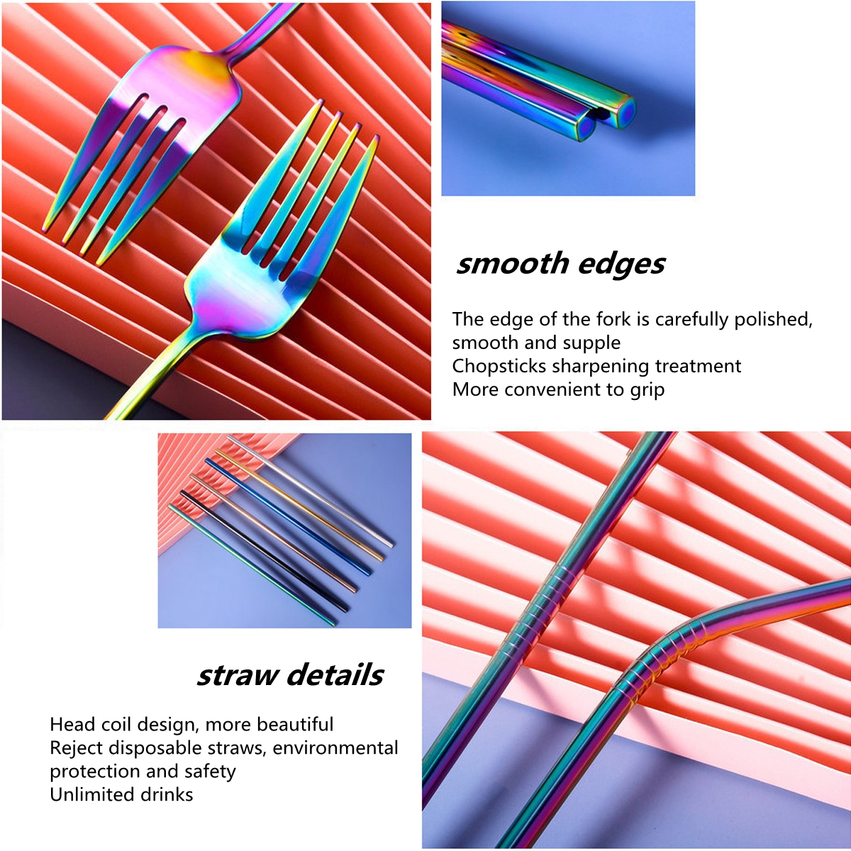 9pcs Titanium-Plated 304 Stainless Steel Cutlery Set Knife Fork Spoon Chopsticks And Straw Combination