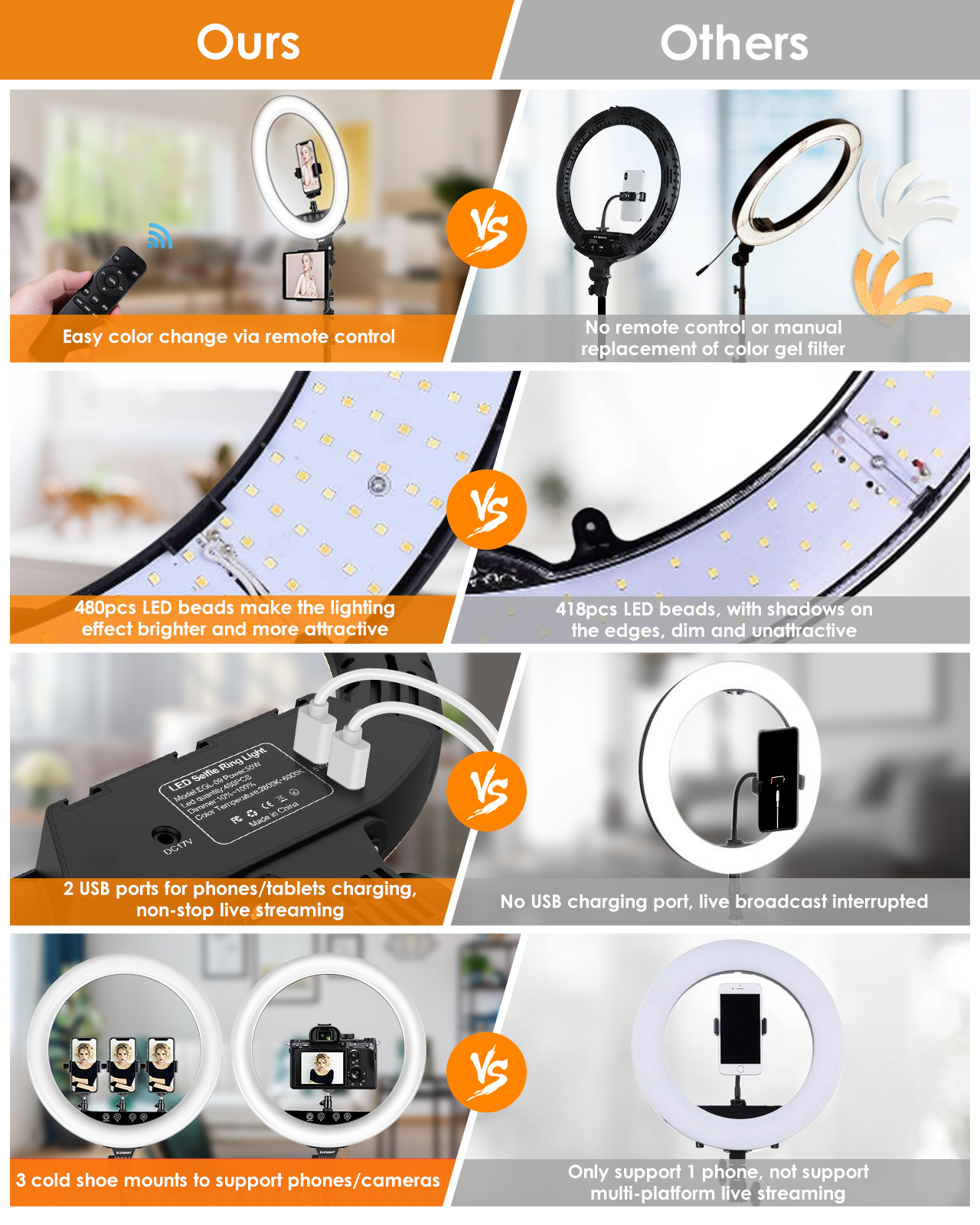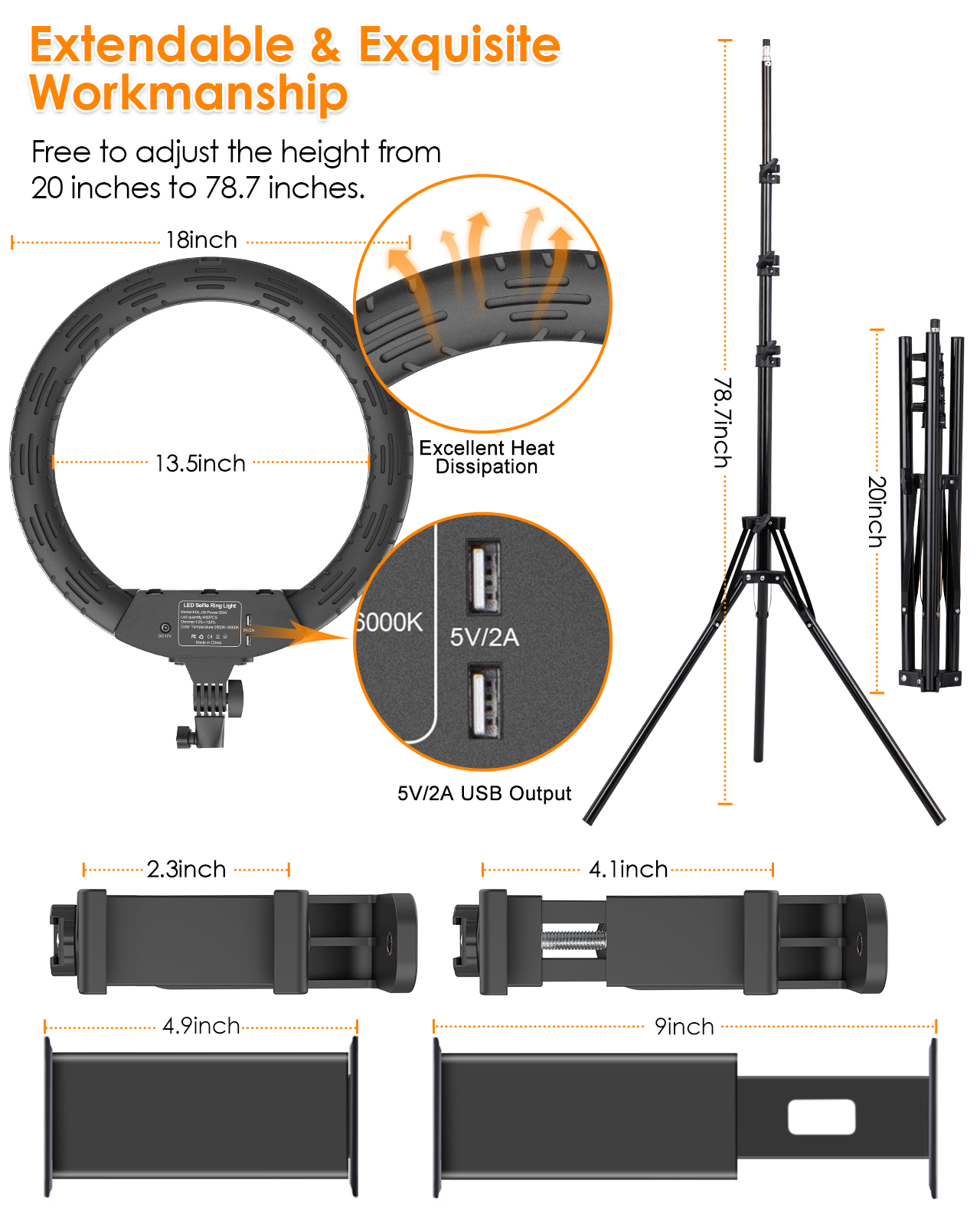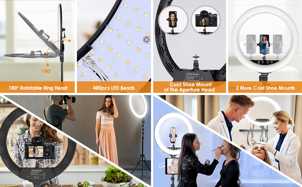 -LEGIANT EGL-09 ring light can adjust the color temperature from 2800K to 6000K. Our 18inch light ring with stand has 480 pcs LED beads. And 3 light modes of this light ring is perfect for different variety of photography, stream Live, beauty makeup, selfies and videos.