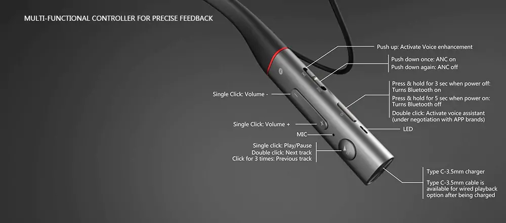 A soft and comfortable neckband with a silicone cover provides a natural, ergonomic fit during prolonged use. Magnetic rear earbud covers form a necklace-like shape for convenient storage around your neck when not in use