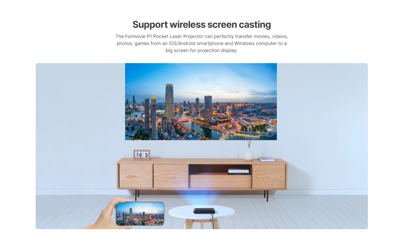 The Formovie P1 Pocket Laser Projector can perfectly transfer movies, videos, photos, games from an iOS/Android smartphone and Windows computer to a big screen for projection display.