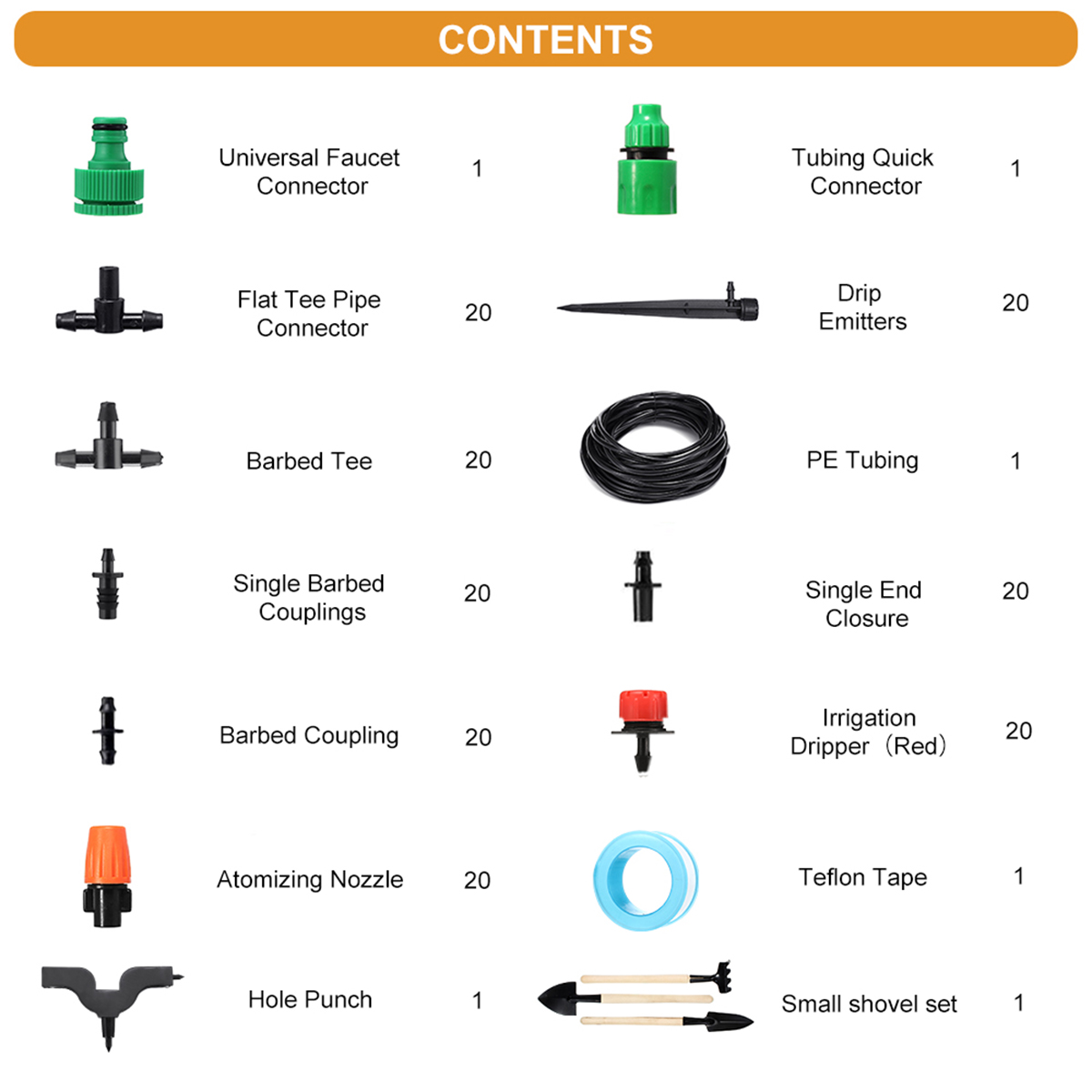 Drip system kit is equipped with 2 faucet connectors:threaded and universal faucet connector. Soak the tube in hot water for 15s before use.With a simple installation, insert fittings and dripper, you can start watering the plants right away without digging or plumbing skills.