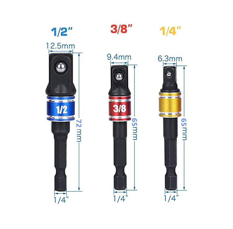 For installation of pneumatic screwdrivers, electric screwdrivers, pneumatic drills, manual screwdrivers and other hexagonal tools. Suitable for universal sockets, impact adapters and reducer kits, universal connectors, socket adapters and drive reducer kits, drive impact socket extension strip kits, drive impact socket kits.
