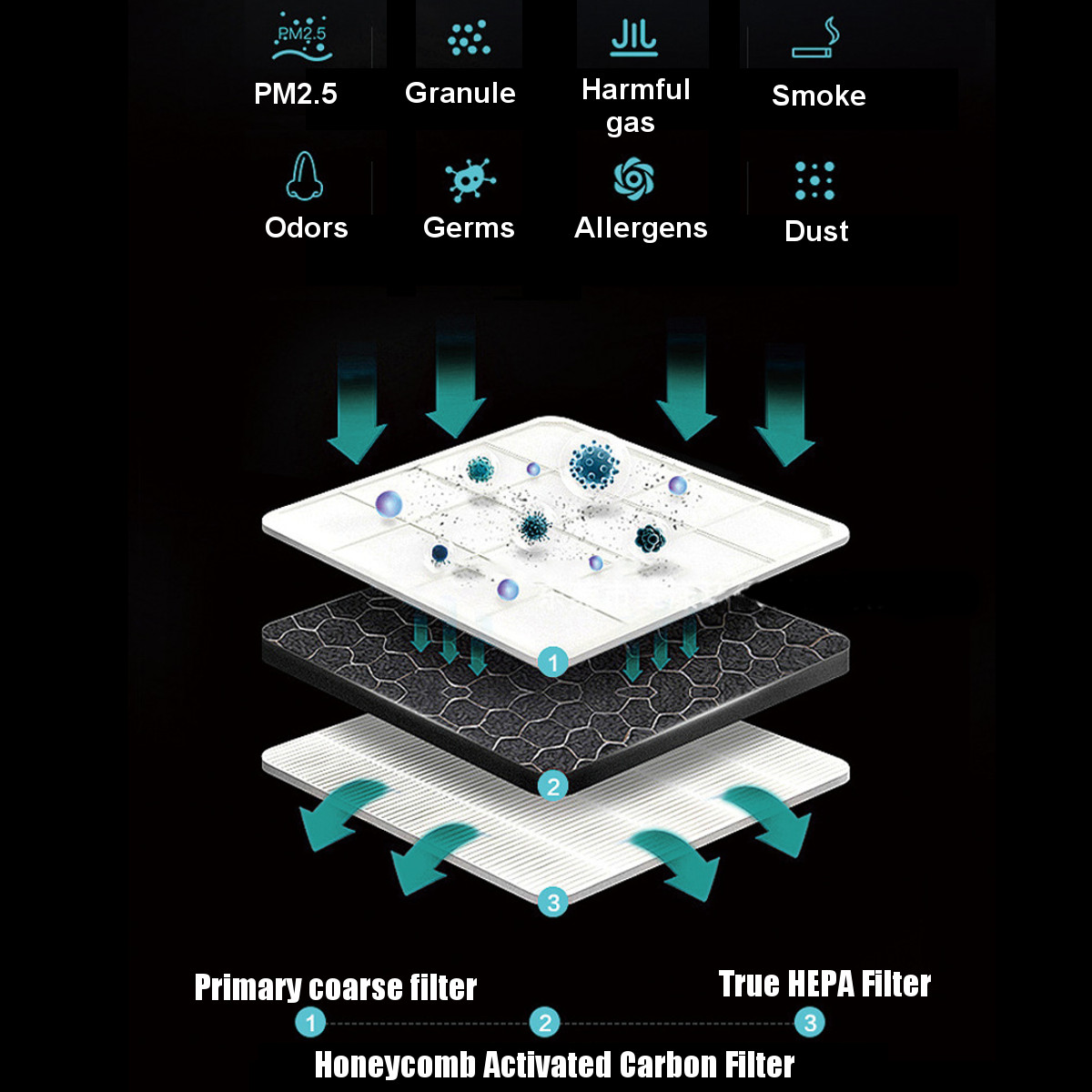 With honeycomb activated carbon filter, true HEPA filter, the purify efficiency is 30% higher and purify speed Is 30% faster than others.