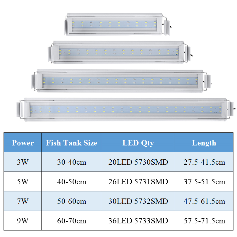 3/5/7/9W 220V US Plug Fish Tank Lamp LED Energy-Saving Blue+White Light Line Switch