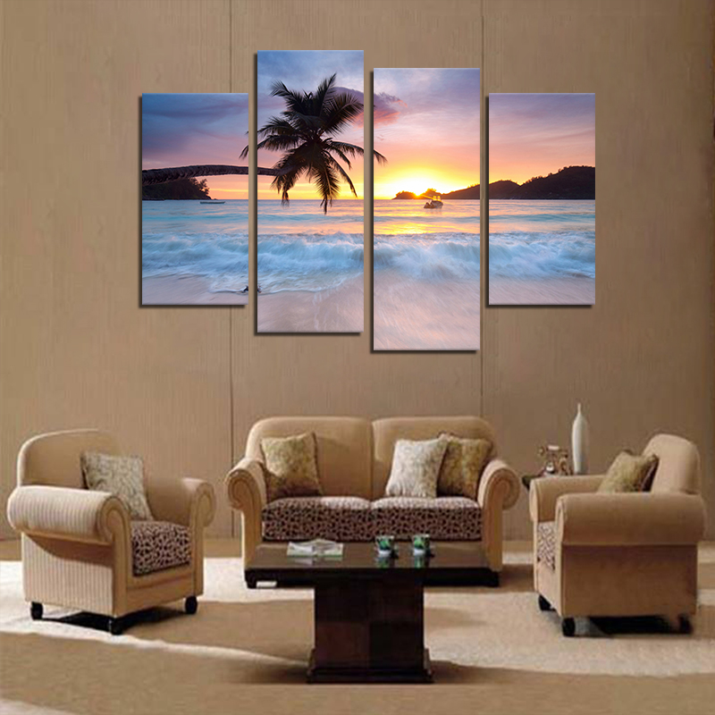 Hand Painted Four Combination Decorative Paintings Seaside Coconut Tree Wall Art For Home Decoration