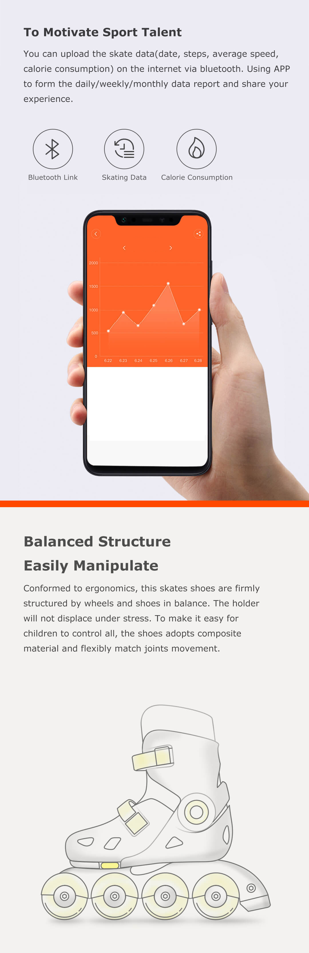 Meanwhile, you can upload the skate data(date, steps, average speed, calorie consumption) on the internet via bluetooth.