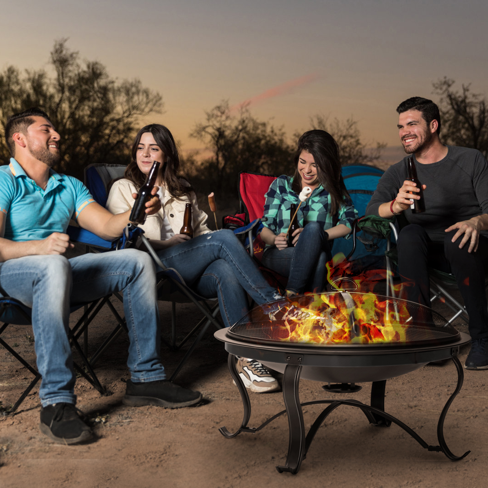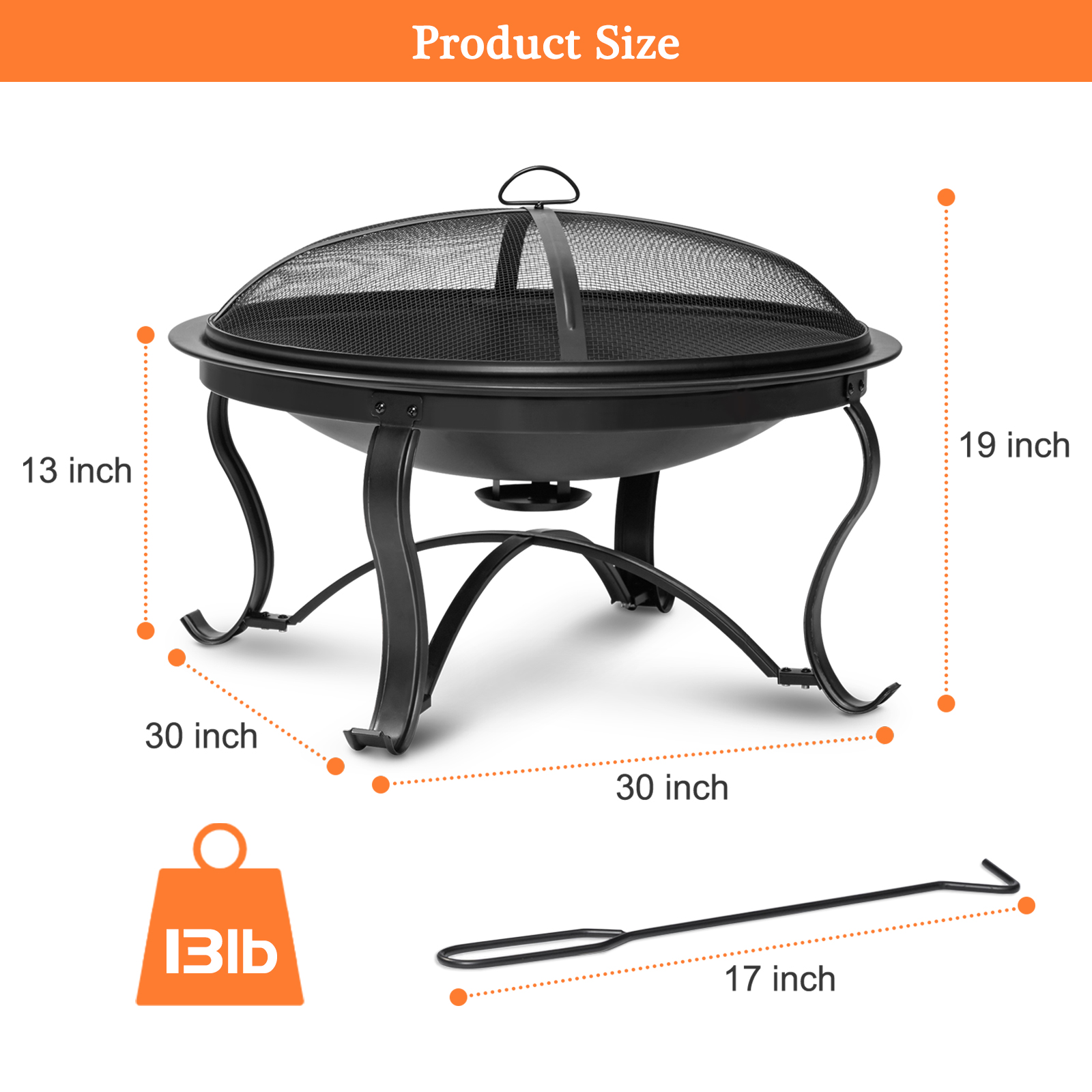 Features | 30 Inch for 3-5 people round fire bowl coated with high temperature paint Mesh cover to reduce the number of escaping sparksDurable steel construction with heavy-duty steel frame Durable & Rust Resistant |