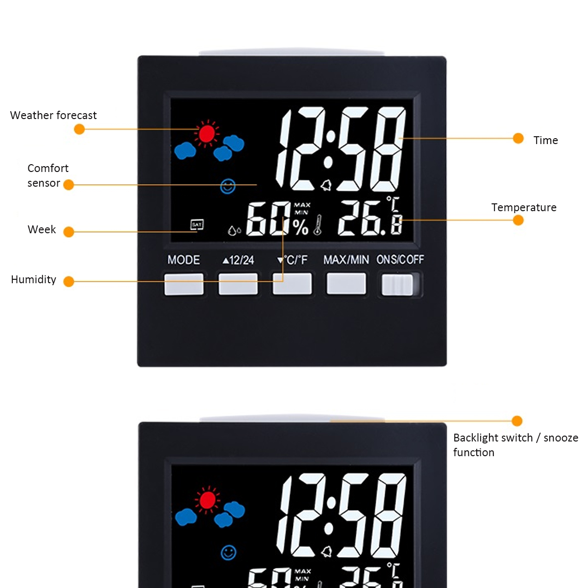 LED Digital Alarm Clock Temperature Humidity Weather Color Display With Backlit