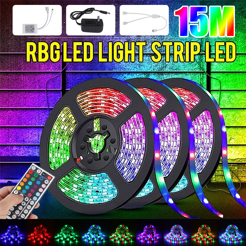 49FT 15M RGB LED Strip Light 3528 Waterproof/Non-waterproof Flexible Tape Lamp DC12V + 44Keys Remote Control + Power Supply