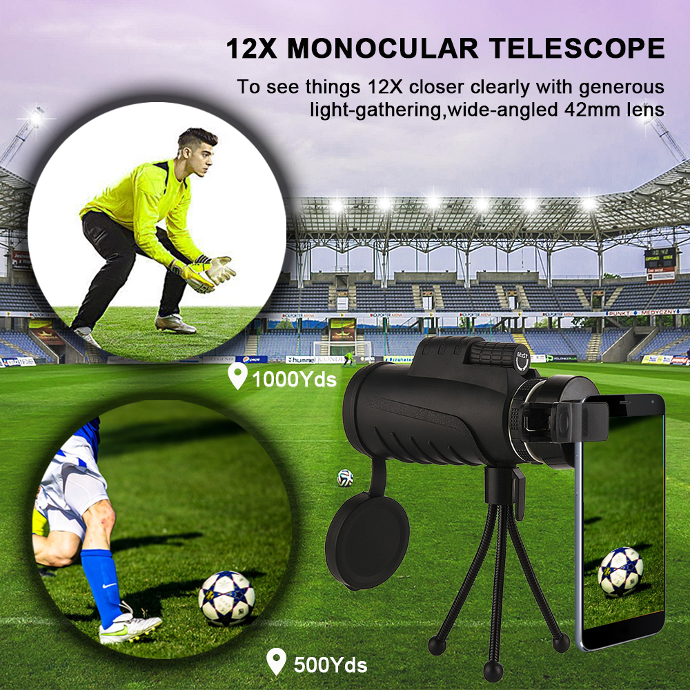 Features: High Power Magnification monocular telescope: To see things 12X closer clearly with generous light-gathering,12x magnification, wide-angled 42mm lens.Enjoy the unprecedented highest level of performance in unique design. (211 ft 1,000Yds)