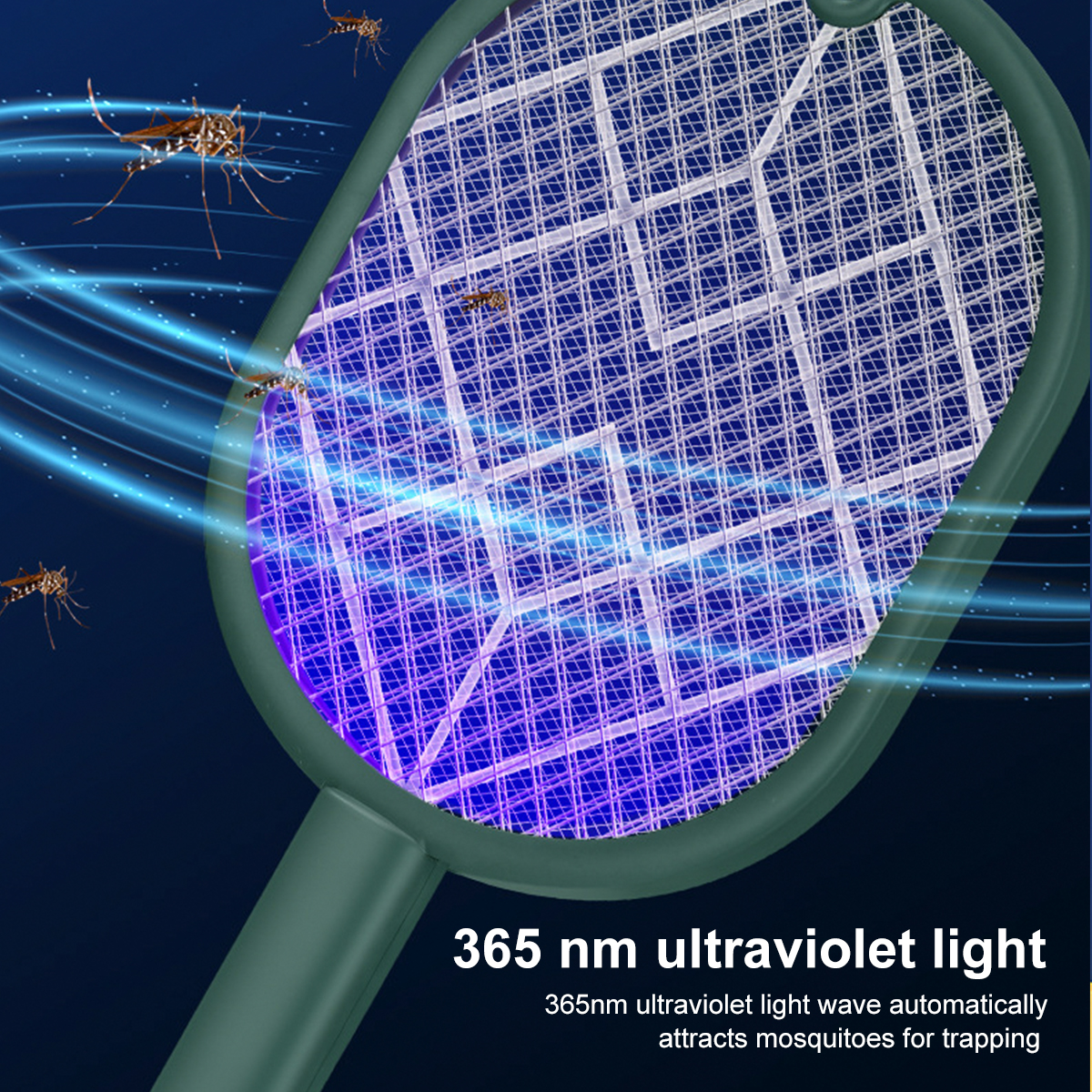 【3-IN-1】handheld mosquito swatter,set as a mosquito lamp on base(368 nm ultraviolet rays automatically attracts mosquitoes for trapping),and the top hole can be hung on a nail.