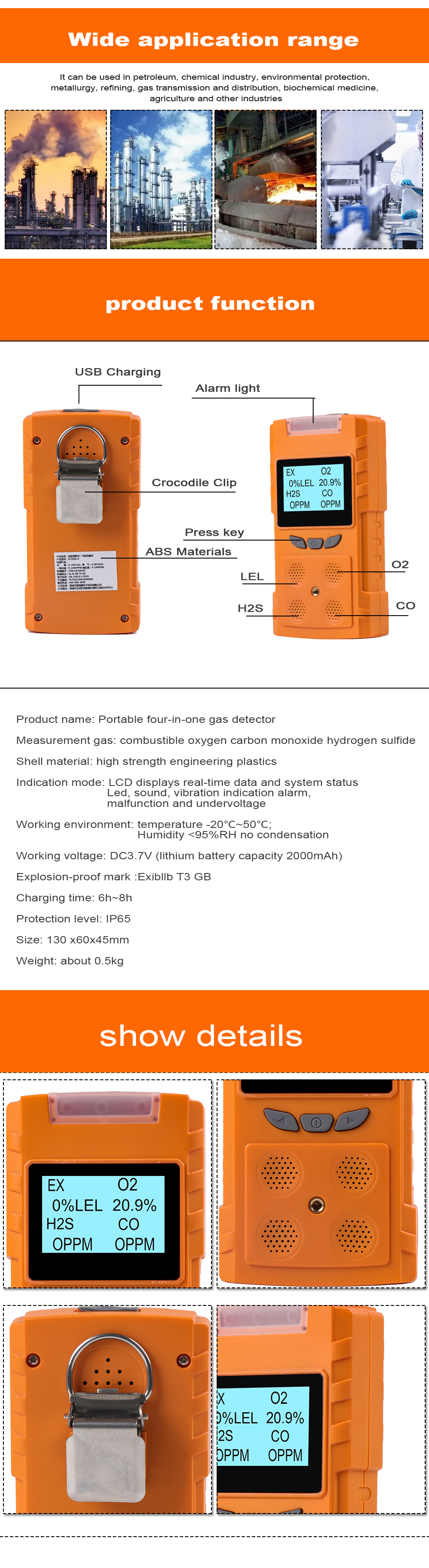 The detector is widely used in petroleum, chemical industry, environmental protection, metallurgy, refining, gas, biochemical medicines, agriculture, fire protection, Archaeology and other industries and places that need safety monitoring for toxicity and harmfulness, explosion prevention. The detector can effectively predict the concentration of dangerous gases and alarm, so as to ensure the safety of workers and production equipment.
