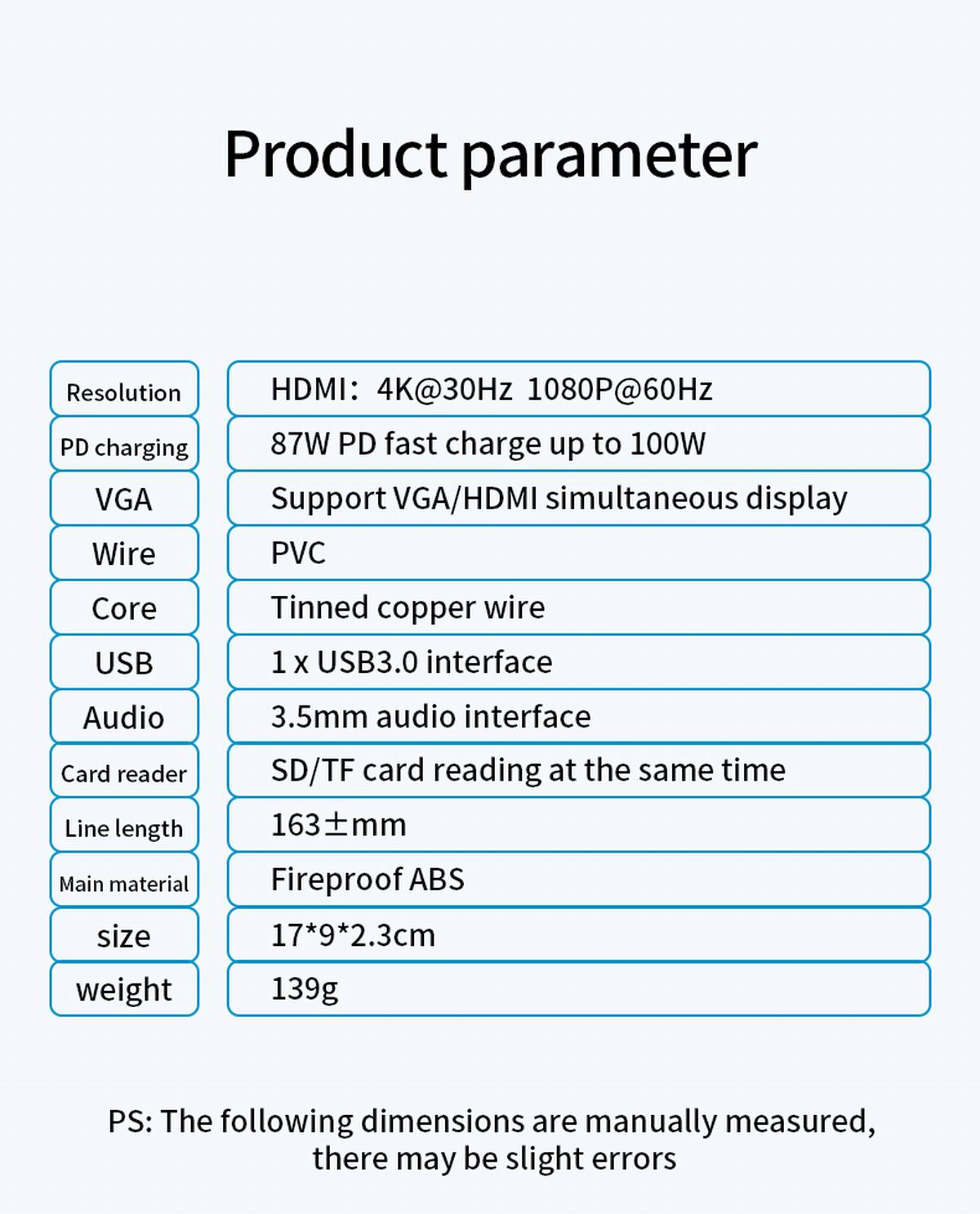 PD+USB3. 0+HDMI+VGA+3.5mm Audio+SD/ TF