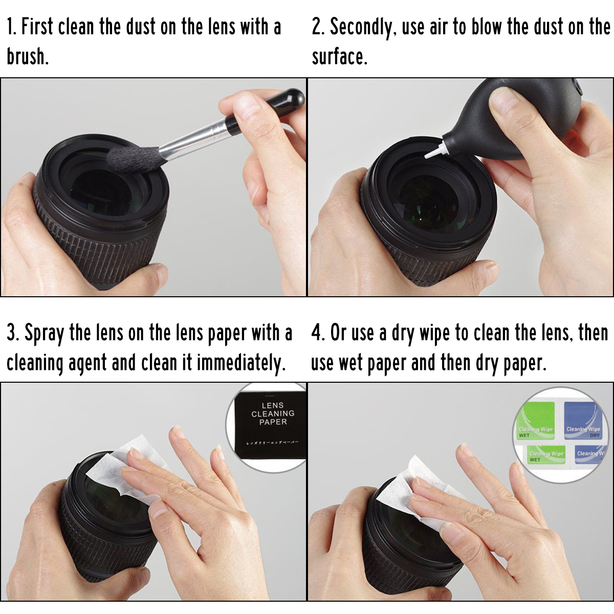 Lens cleaning pen: The soft brush retracts into the pen body to stay clean. Use the brush to dust off any particles and debris.