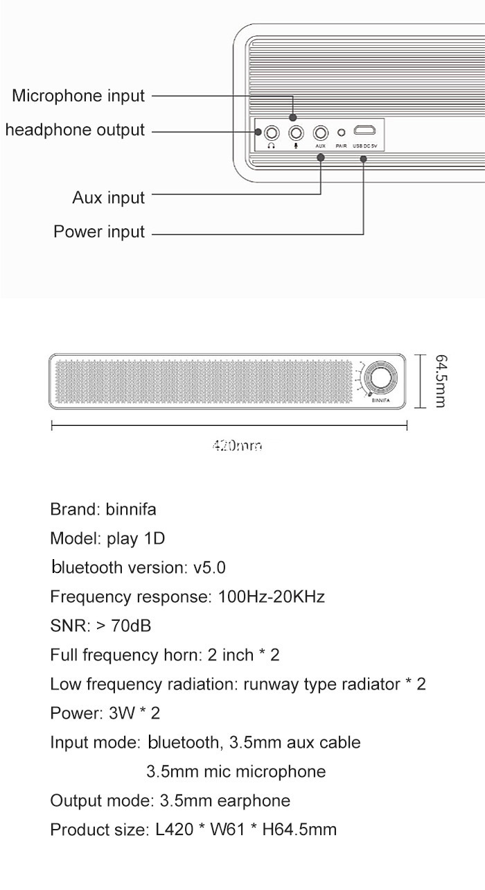 Input mode: Bluetooth, 3.5mmAUX wired/3.5mmMIC microphone