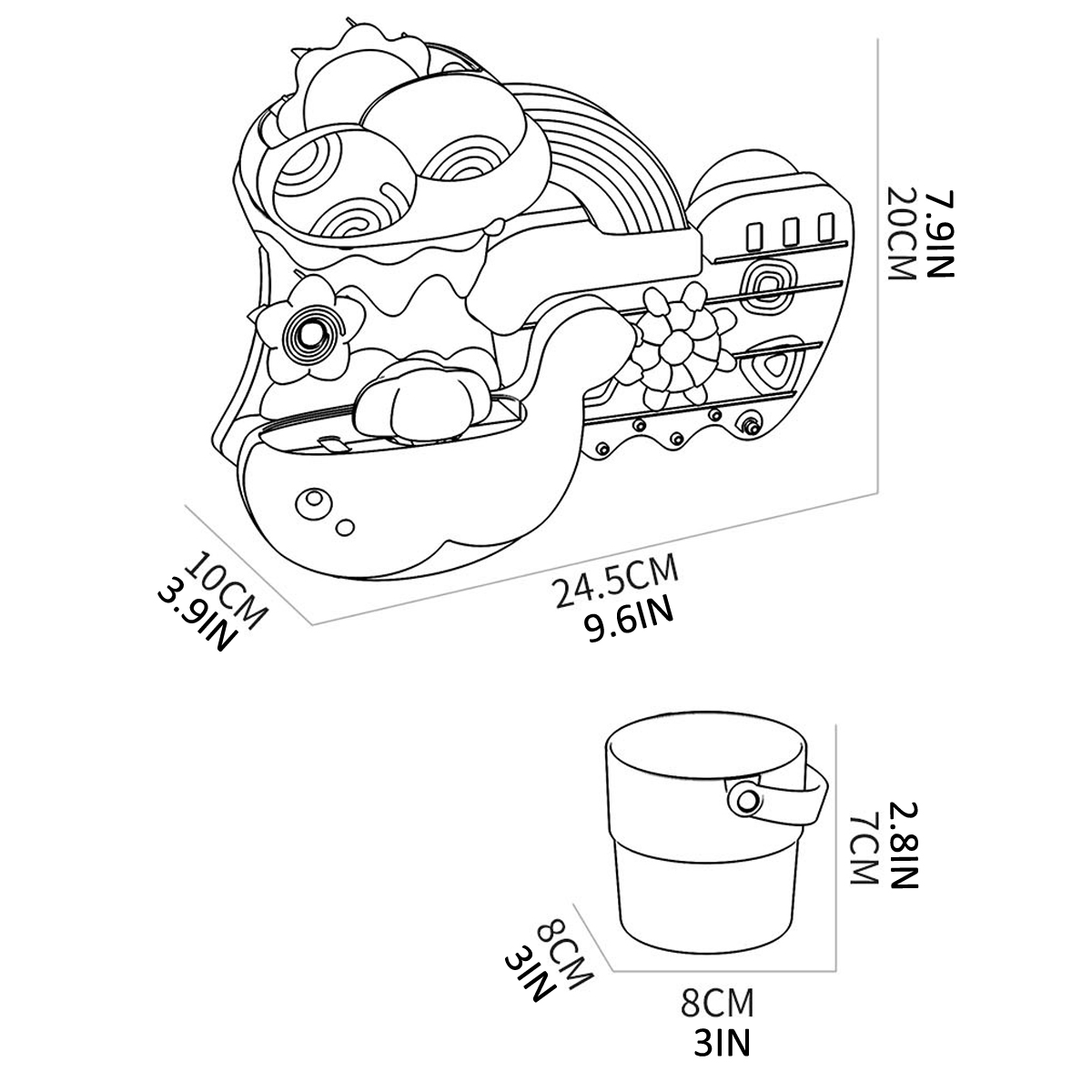 - Rotating flowers (after the water is injected, the water slides down through the rainbow bridge and touches the mechanism in the small fish, the flowers and the lifebuoy will rotate).