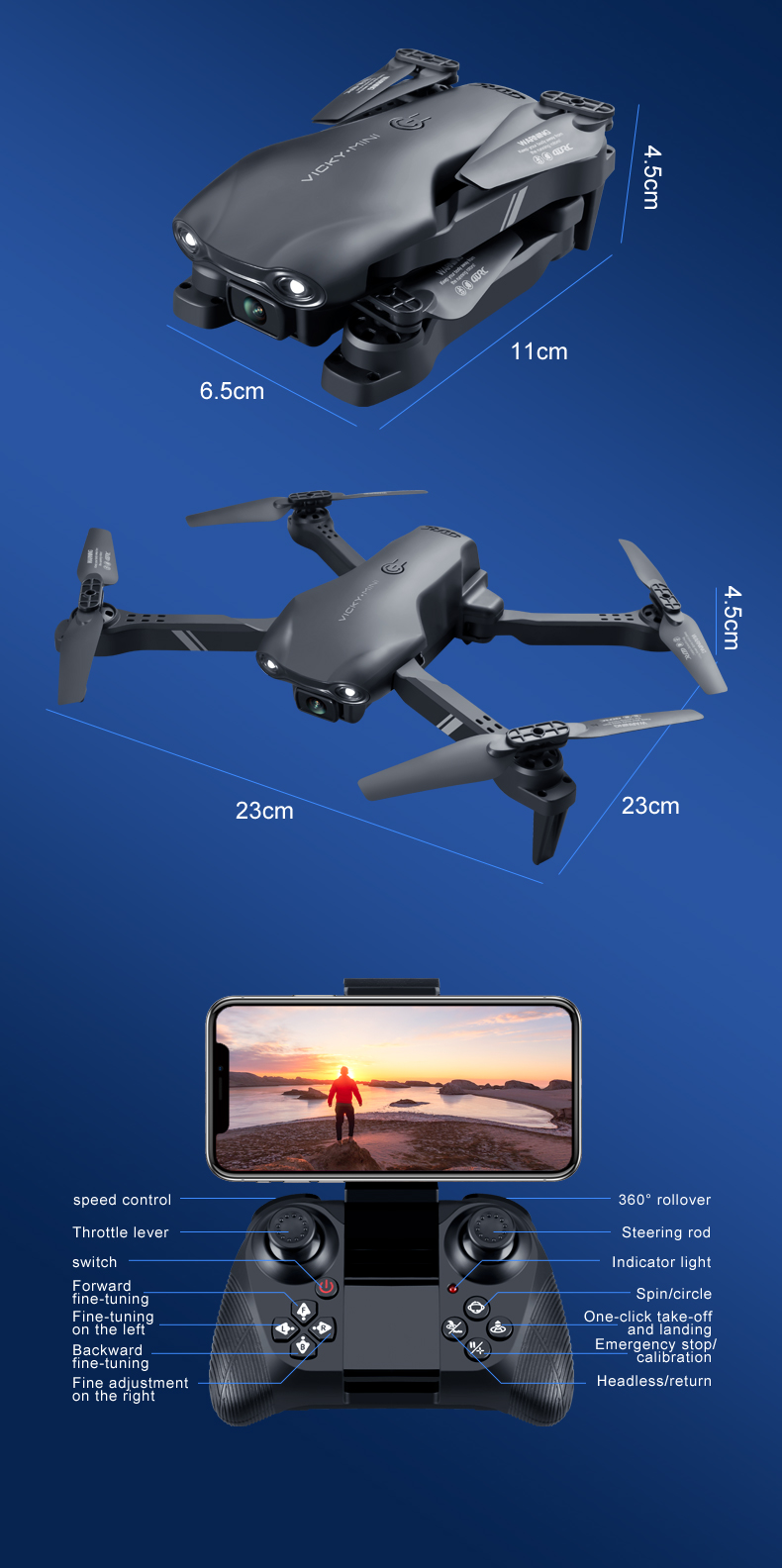 Up/down, Forward/backward, Turn left/right, Sideward flight, Headless Mode, One Key Automatic Return, Altitude Hold Mode