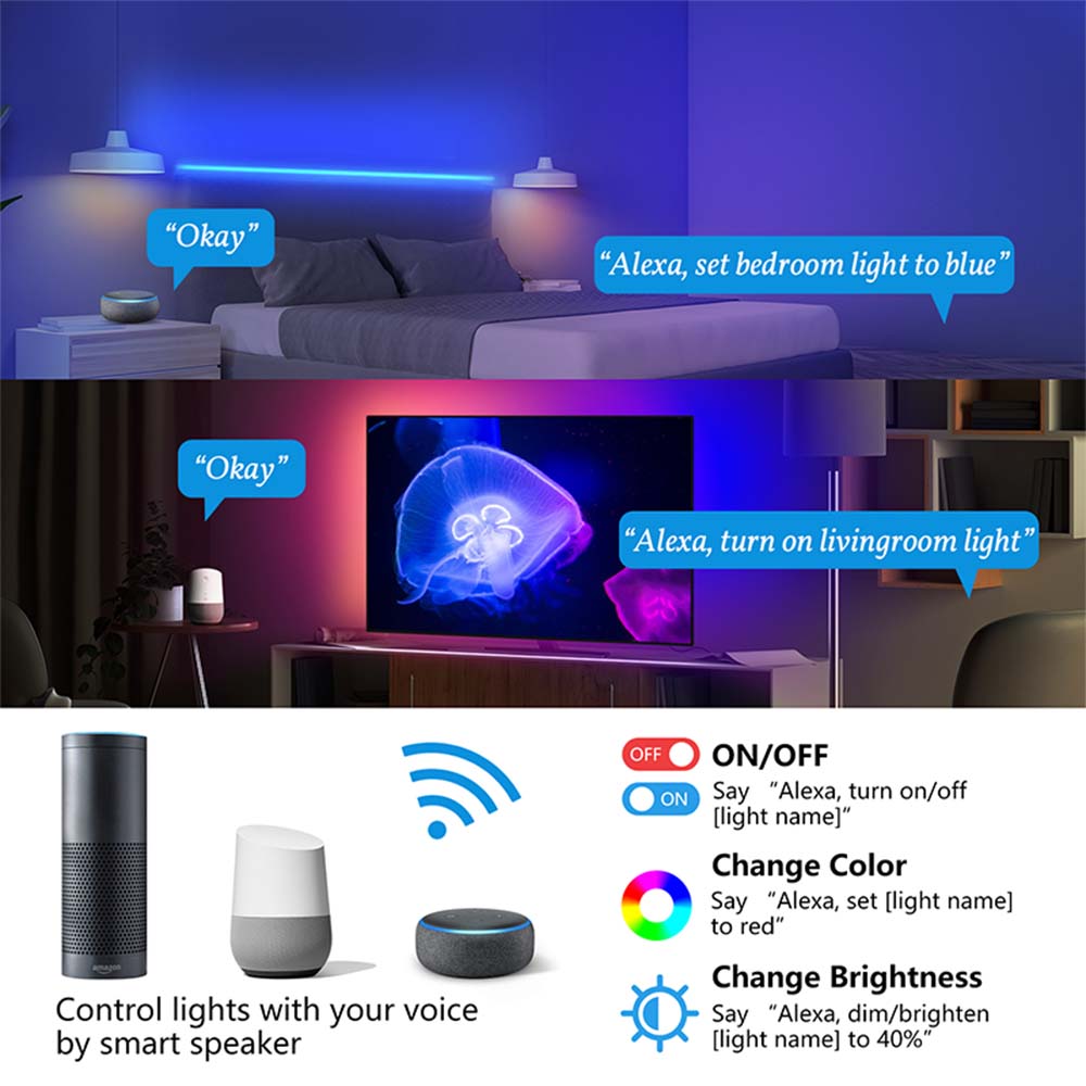 Smart WiFi LED lights can be used with Alexa and Google Assistant . Free your hands and turn lights on and off , change colors or adjust brightness with simple voice commands . Please note that our light strips are only compatible with 2.4GHz networks and do not support 5GHz Wifi .