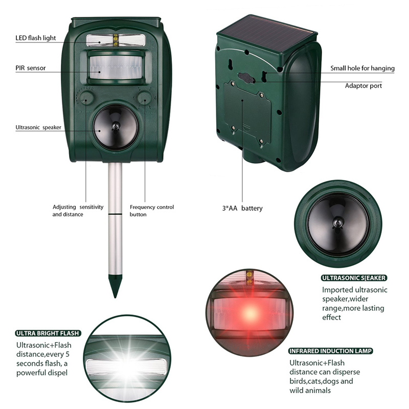 【Get Rid of Animals】:The Repeller gets rid of animals through emitting a mixture of ultrasonic, adjustable ultrasonic wave frequencies and powerful flashing LED strobe lights and alarm, expels cats, dogs, squirrels, deer, bears, birds (pigeons, seagulls, etc.), skunks, bats, rats, foxes, raccoons, mice and much more.