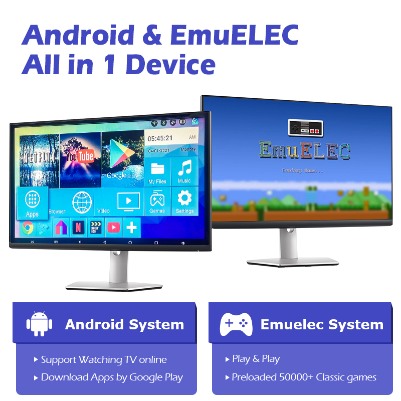New upgraded dual system mode, Emuelec, and Android dual system support KDI function, you can watch TV movies for free, and support downloading the app, such as Google, Youtube, etc.