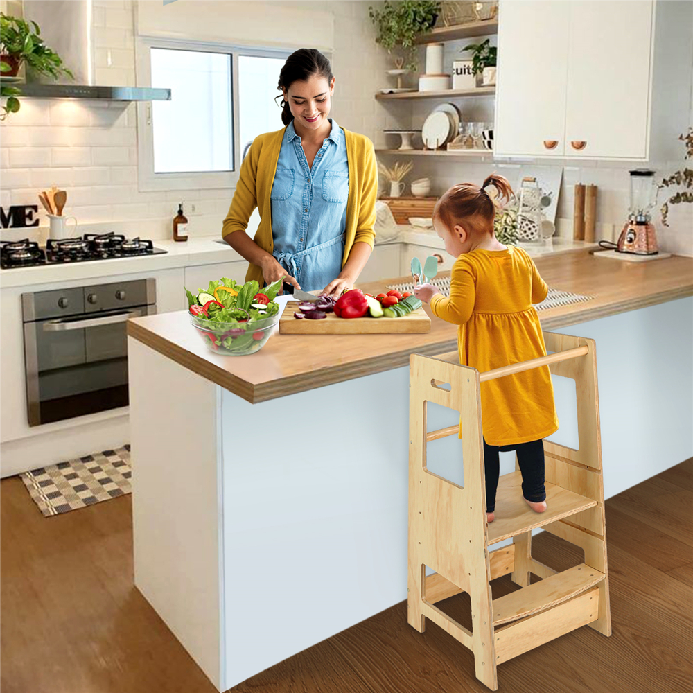 ● NATURAL WOOD FINISH CHILD KITCHEN STANDING TOWER: The child kitchen step stool that lets toddlers help in the kitchen! The Standing Tower contains style, safety, and durability! Consistently rated as the top step stool standing tower for helping & learning in the kitchen!